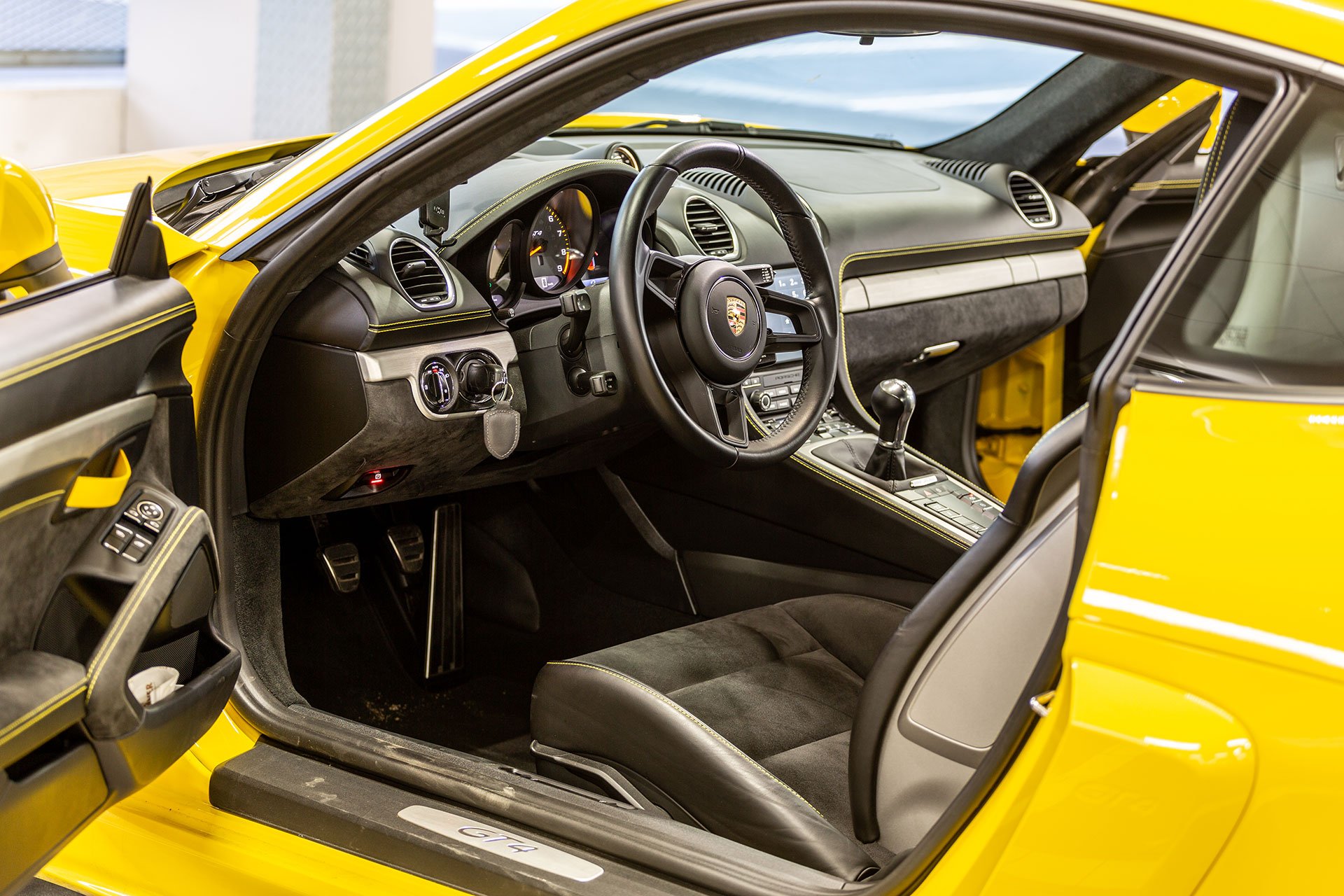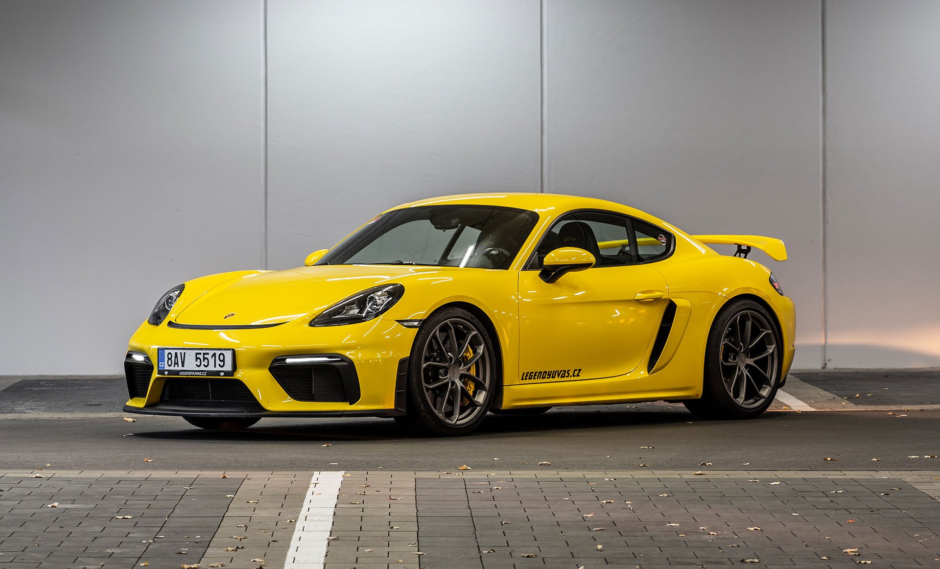 Žluté Porsche 718 GT4 ve fotogalerii pohání šestiválec 4,0 l s výkonem 420 koní, 8.000 ot./min. Zrychlení z 0 na 100 km/h za 4,2 sekundy, maximální rychlost 304 km/h. Porsche má tradičně pohon zadní nápravy. GT4 je speciální úprava, kterou ocení uživatel především na okruhu, samozřejmostí je odlehčená karosérie a množství závodních doplňků. Cayman je skvěle ovladatelné Porsche, pro méně zkušené řidiče je vhodnější než o něco silnější a větší Porsche 911 GT3