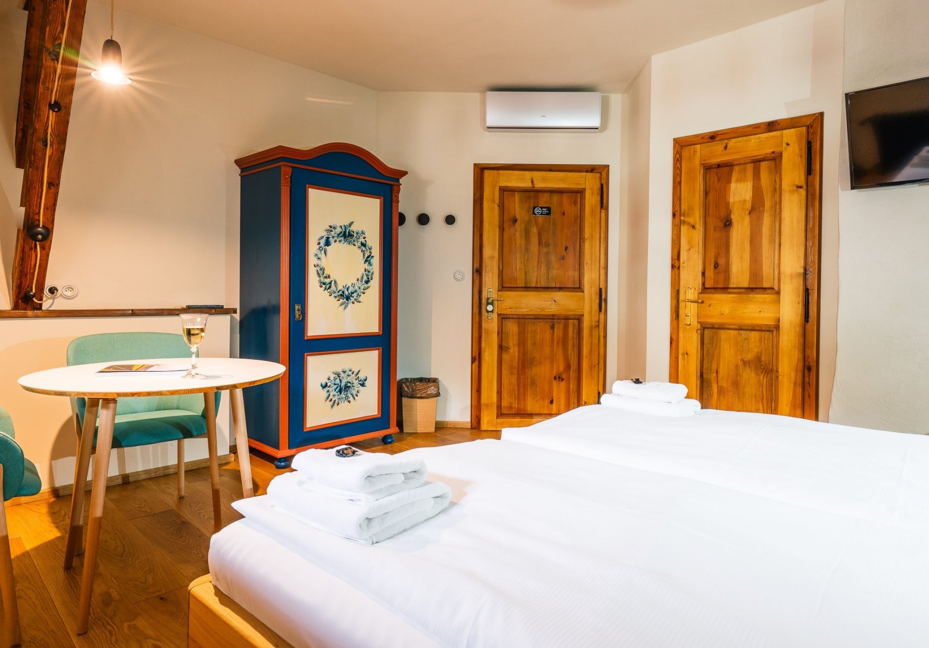 BKrásný pokoj, na uvítání na nás čekalo na stole víno a vstupenky na pár aktivit v Českém Krumlově. Pohodlná postel, měkké špunty do uší v šupleti. Čisto. Minibar byl na chodbě, ale určitě by se hodil i do pokoje. Jinak vše skvělé.