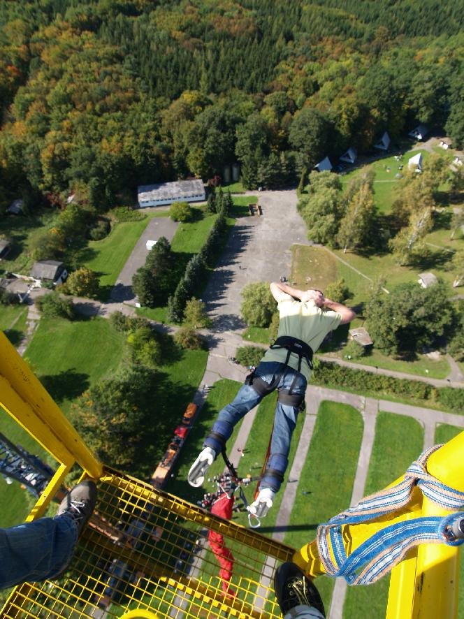 A teď to nejdůležitější – jak chcete skočit? To jak skočíte jen na vás, můžete to okoukat od skokanů před vámi a rozhodnout se až těsně před seskokem. Máte vybráno? Tak můžeme jít na to! Jeřáb vás vyveze do potřebné výšky… Postavíte se až na hranu klece a počkáte na odpočet. Po slově JUMP se odrazíte a letíte dolů. Na chvíli zažijete jedinečný stav beztíže, než vás lano – těsně nad zemí vymrští zpět. Pokud máte strach skákat sami, můžete si adrenalin vychutnat i ve dvou….