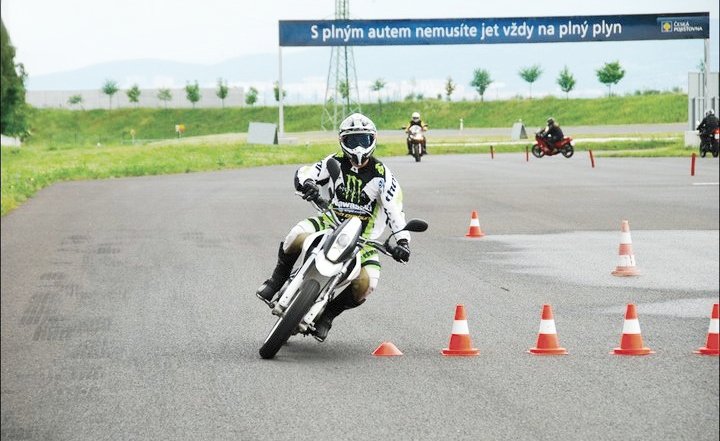 V praktické části se zaměříme na správnou techniku jízdy a stabilitu. Budete trénovat vyhýbací manévry, krizové brzdění na suchu i na mokru. V závěrečné části se zaměříme na techniku nájezdu do zatáčky a na vyhýbací manévry v zatáčce.