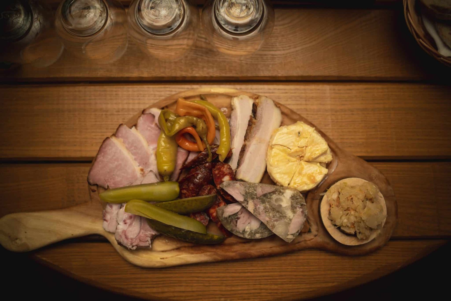 První chod – Z udírny pánů hradních „Kouřem políbené lahůdky“ Výběr hradních uzenin – domácí klobásky, uzené vepřové, šunka od kosti, škvarková pomazánka, podávané s domácími pšeničnými plackami z hradní pece, hořčicí a cibulí. Nápoj: Pivo černé, hutné, s vůní kouře a karamelu, jak se sluší k poctivé hostině rytířů.