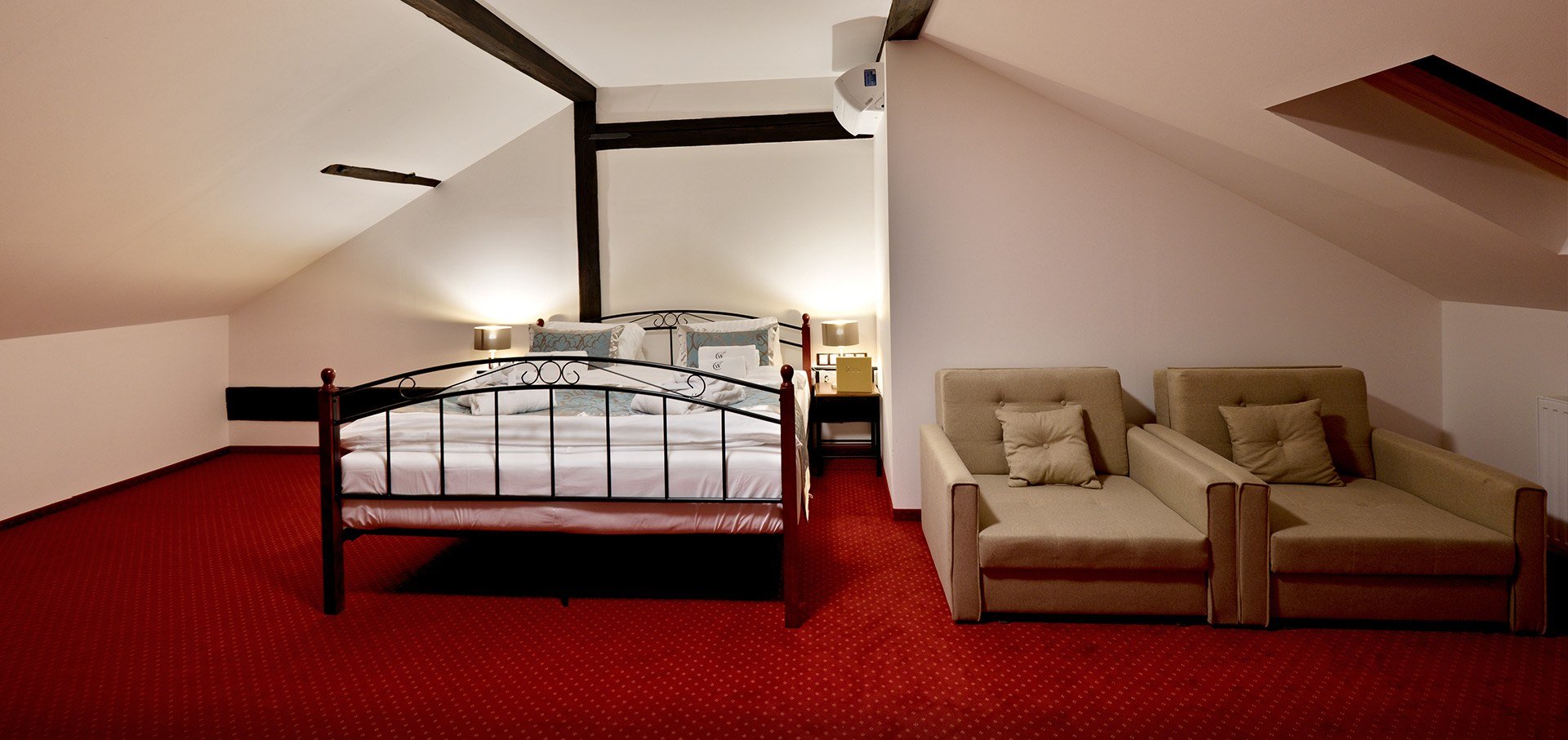 Podkrovní pokoje dvoulůžkový s přistýlkou jsou určeny převážně pro páry, ve dvou pokojích se však nachází také přistýlka. Tyto podkrovní pokoje jsou v moderním stylu a velmi útulné.