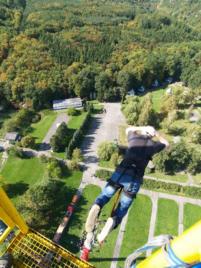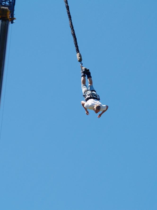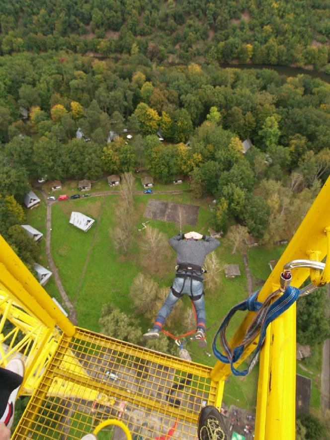 A teď to nejdůležitější – jak chcete skočit? To jak skočíte jen na vás, můžete to okoukat od skokanů před vámi a rozhodnout se až těsně před seskokem. Máte vybráno? Tak můžeme jít na to! Jeřáb vás vyveze do potřebné výšky… Postavíte se až na hranu klece a počkáte na odpočet. Po slově JUMP se odrazíte a letíte dolů. Na chvíli zažijete jedinečný stav beztíže, než vás lano – těsně nad zemí vymrští zpět. Pokud máte strach skákat sami, můžete si adrenalin vychutnat i ve dvou….
