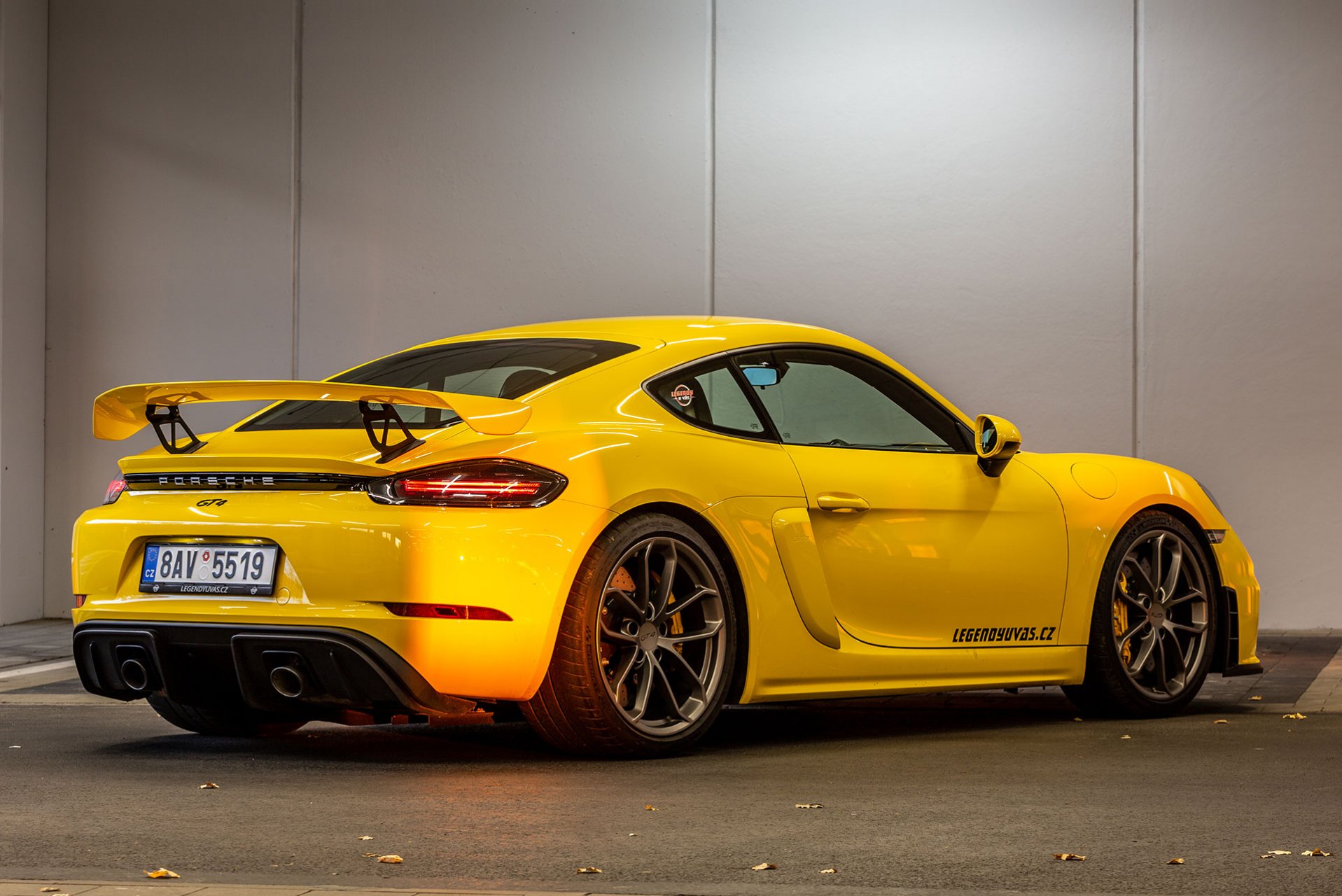 Žluté Porsche 718 GT4 ve fotogalerii pohání šestiválec 4,0 l s výkonem 420 koní, 8.000 ot./min. Zrychlení z 0 na 100 km/h za 4,2 sekundy, maximální rychlost 304 km/h. Porsche má tradičně pohon zadní nápravy. GT4 je speciální úprava, kterou ocení uživatel především na okruhu, samozřejmostí je odlehčená karosérie a množství závodních doplňků. Cayman je skvěle ovladatelné Porsche, pro méně zkušené řidiče je vhodnější než o něco silnější a větší Porsche 911 GT3