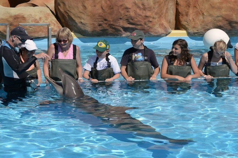 Přibližně 20 minut strávíte v zářivé společnosti delfínů a jejich cvičitelů. Cvičitelé vám poodhalí tajemství jejich vzájemného vztahu, výcviku i her... Dozvíte se to, co neni napsáno v žádné učebnici a přímo od těch nejpovolanějších. Budete v jejich těsné blízkosti. Upozorňujeme, že se nejedná o plavání s delfínem, nicméně delfína si každý účastník pohladí. Za poplatek lze zakoupit památnou fotografii (cca 15eur).