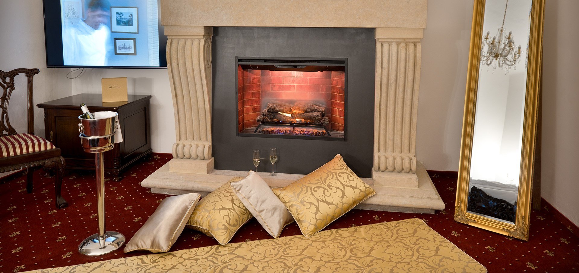 Zámecký pokoj s krbem je vybaven zámeckým nábytkem a krásným velkým krbem, který navodí romantickou atmosféru.